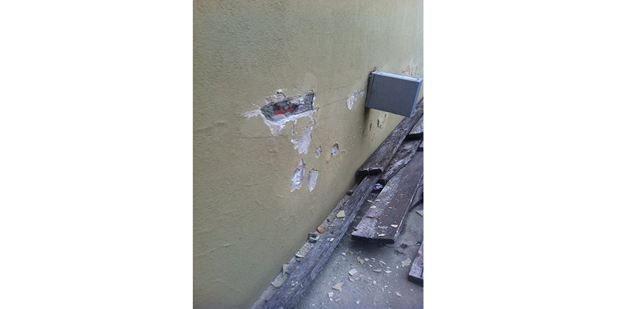 Molduras externas: Se colocaron en forma vertical 64 mts lineales de zingueria y posterior pintado en misma tonalidad que los muros, de manera ocultar la cantidad de cables de TV que en forma externa presentaba un aspecto estético desprolijo y poco uniforme.